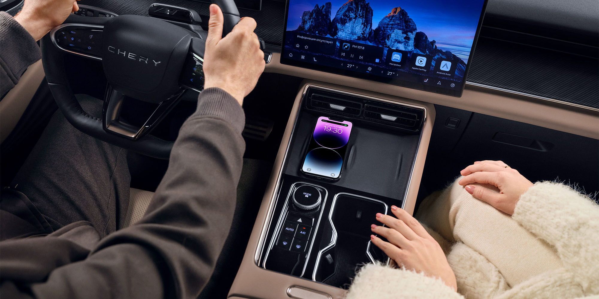 Мультимедиа-система флагманского TIGGO 9 действительно впечатляет. «Парящий» экран приборной панели (10.3 дюйма) и основной экран (15.6 дюйма) с высоким разрешением (Ultra HD 2560 x 1440) создают современный и стильный интерфейс. Узкая рамка и тонкий профиль экрана добавляют элегантности и минимализма в общий дизайн салона. Мультимедийный комплекс обеспечивает не только высокое качество изображения, но и удобство в использовании, позволяя водителю и пассажирам легко управлять функциями автомобиля, навигацией и мультимедийным контентом. Интуитивно понятный интерфейс и поддержка различных технологий, таких как Bluetooth и беспроводной протокол Apple CarPlay/Android Auto, делают поездки более комфортными и приятными. Проекционный дисплей (HUD) и голосовое управление позволяют сосредоточиться на дороге, не отвлекаясь на управление мультимедиа системой. Особого внимания заслуживают сенсорные кнопки c высокой чувствительностью, которые вдобавок обладают приятными тактильными ощущениями. Каждый элемент интерьера TIGGO 9 подчеркивает новый уровень качества, комфорта и технологий.